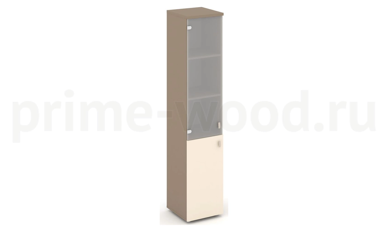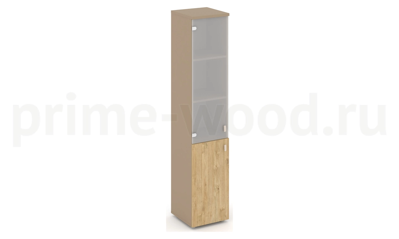 Шкаф высокий узкий левый (1 низкий фасад ЛДСП + 1 средний фасад стекло сатин матовый)