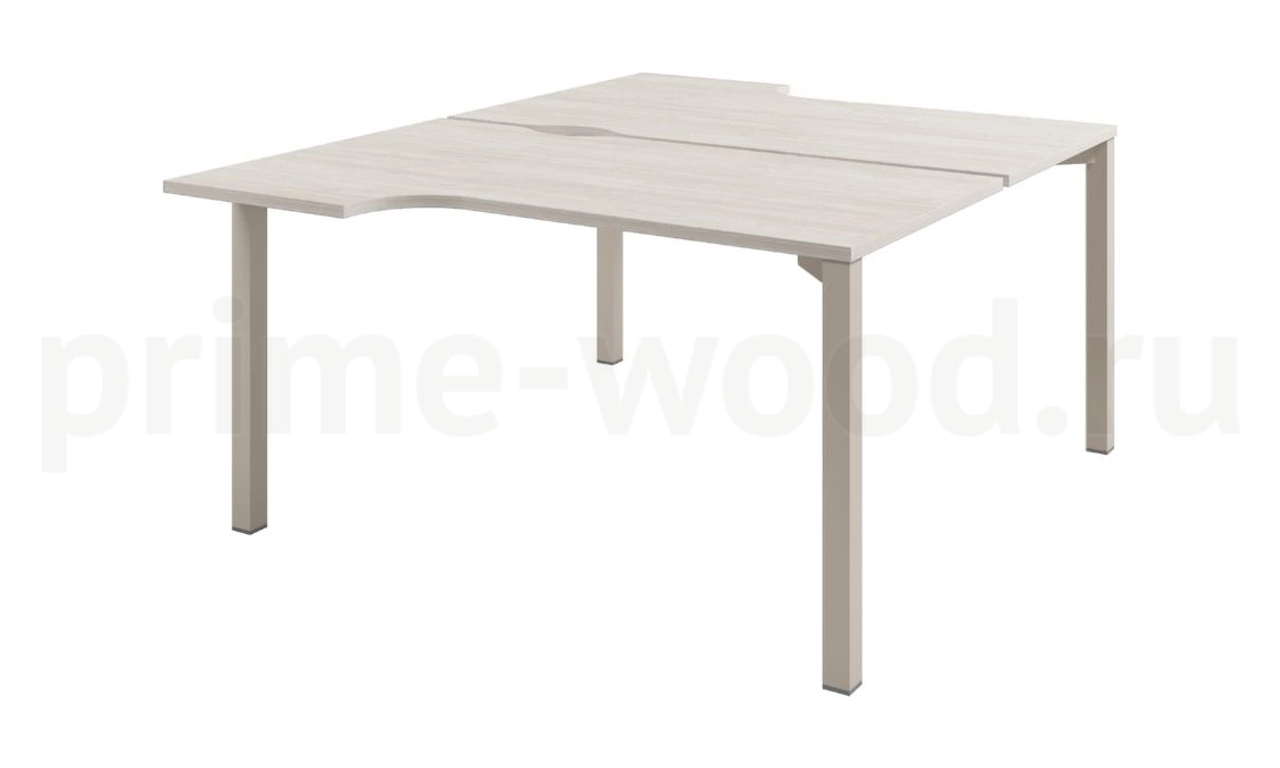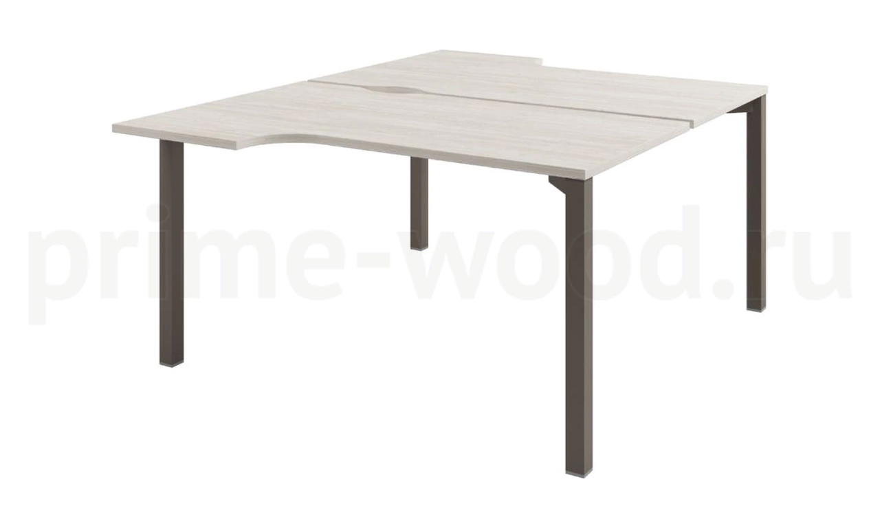 Стол-тандем на 2 рабочих места с эргономичными столешницами. Опоры стола - труба сечением 50*50. Траверсы заглублены на 196 мм. Между столешницами зазор 32 мм для установки фронтального экрана. На длинной стороне столешниц сделаны вырезы для организации кабель-менеджмента. Цвет металлокаркаса "Кашемир" и "Трюфель", текстура – муар.